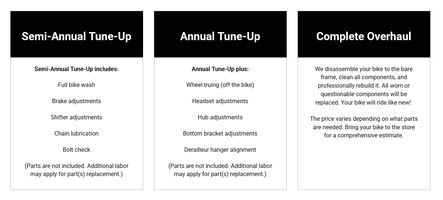 Tune-Up packages are designed to adjust and maintain an already working bicycle. Repairs address worn, damaged, or missing parts. Repairs are available à la carte or as part of a tune-up package. Once your bicycle is in good working order annual tune-ups are recommended.